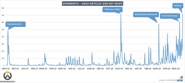 The media rushed to cover the beta, which attracted over 9.7 million players, the release date announcement, and the reveal that Overwatch wouldn’t be free-to-play — which alone accounted for over 700 articles.