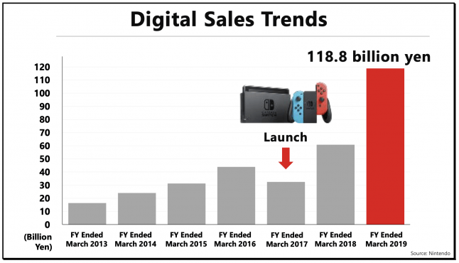 Newsbrief: Digital sales have been on the rise for Nintendo since the Switch released in March 2017, so much so that digital sales across all Nintendo platforms for the year surpassed 100 billion yen (and $1 billion as well) for the very first time.